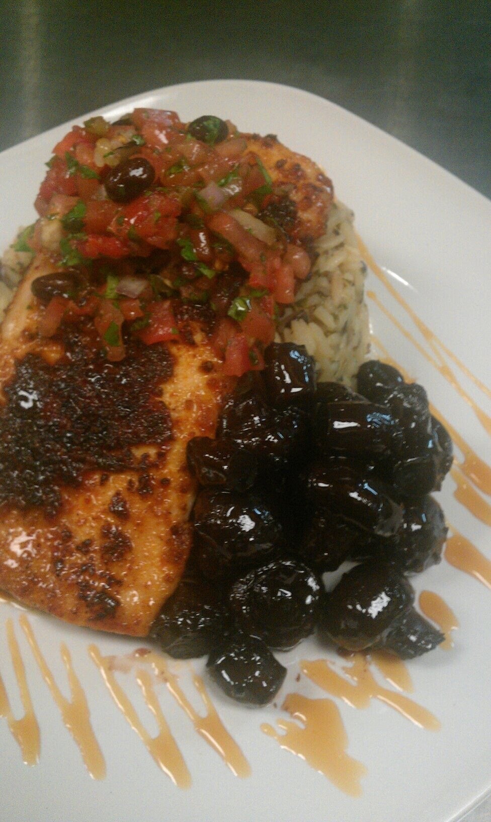 Pan Seared Mahi Mahi on a bed of Rice Pilaf w/ a Black Bean Pico De Gallo, Burgundy Mushrooms and a White Balsamic Glaze
